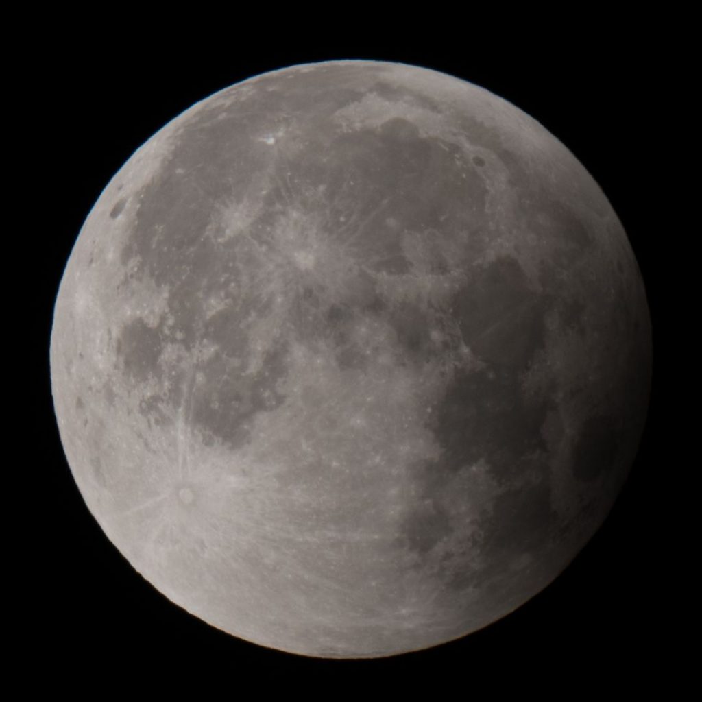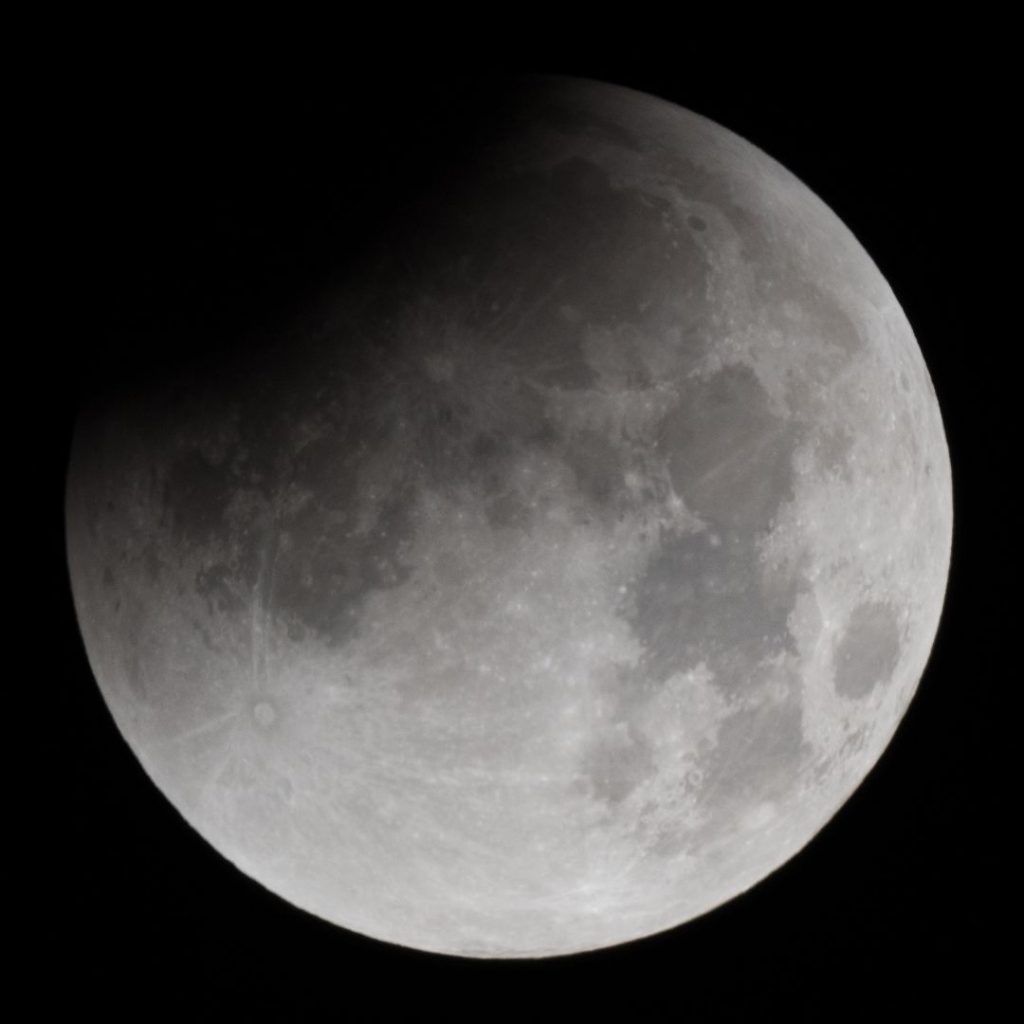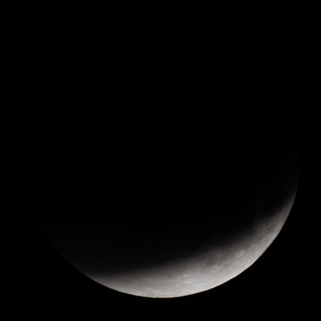 Eintritt in den Kernschatten. Bereits auf dem ersten Bild, aufgenommen gegen 3 Uhr, kann man links oben eine Verdunkelung erkennen.