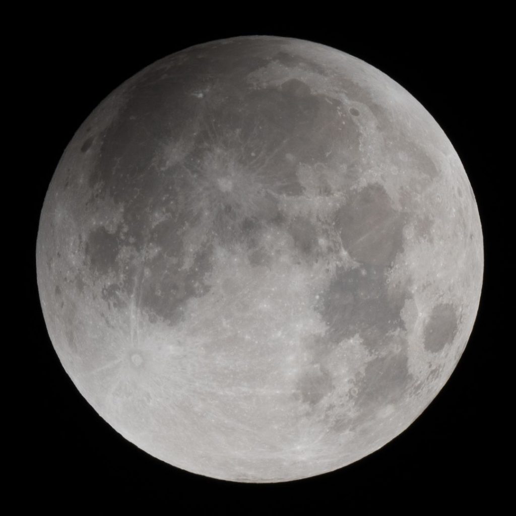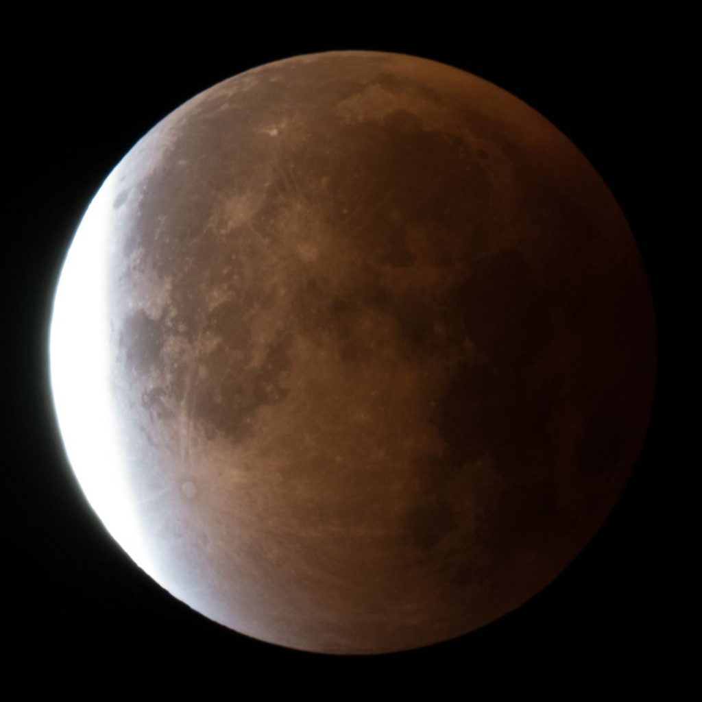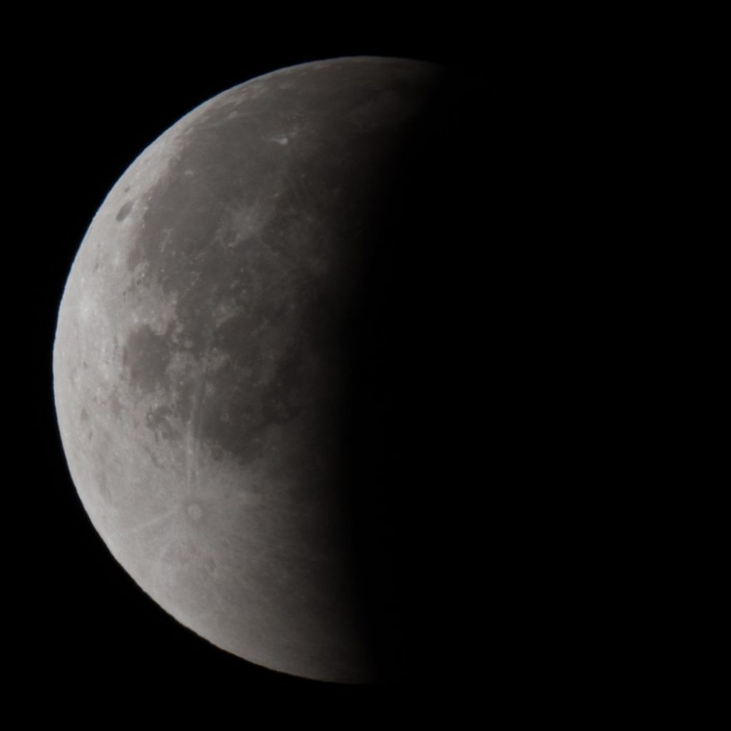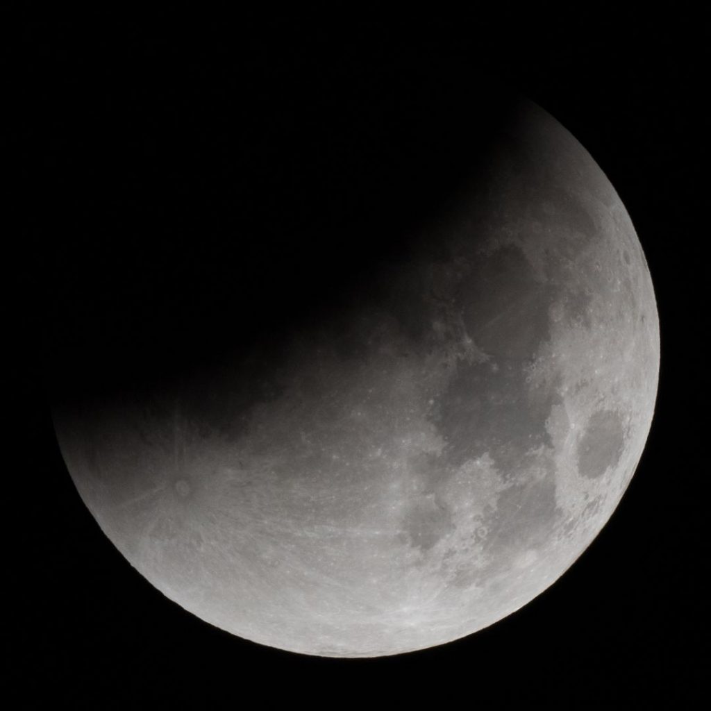 Eintritt in den Kernschatten. Bereits auf dem ersten Bild, aufgenommen gegen 3 Uhr, kann man links oben eine Verdunkelung erkennen.