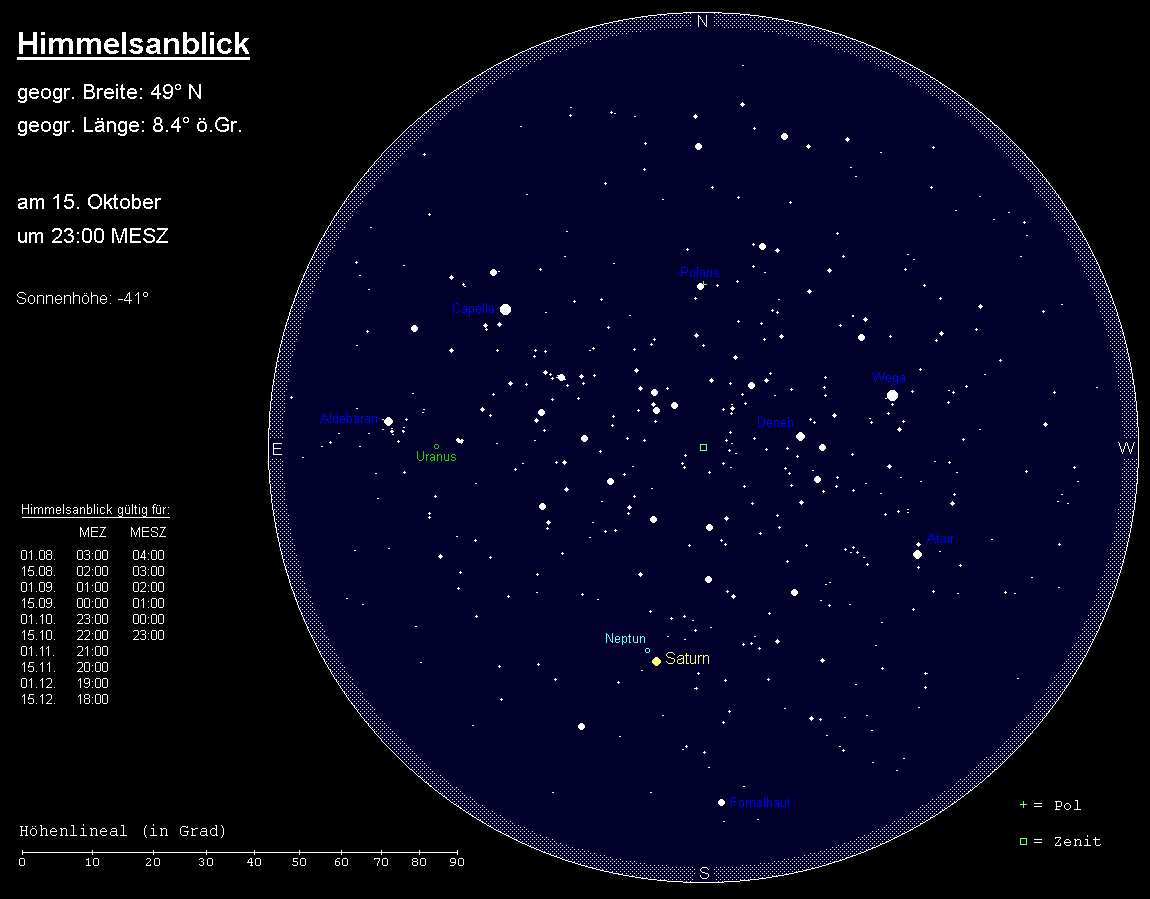 stand Ende September in Opposition zur Sonne und kann damit im Oktober optimal beobachtet werden. Der 7.8m helle Planet bewegt sich rückläufig durch den Westteil des Sternbilds Fische, nahe der vier im Fernglas gut erkennbaren Sterne 27, 29, 30 und 33 Psc. Die beste Beobachtungszeit ergibt sich um die Kulmination, die er am 1. Oktober um 0:45 MESZ, am 31. Oktober um 21:45 MEZ erreicht. Der Untergang des fernsten Planeten verlagert sich im Laufe des Oktobers von 6:45 MESZ auf 3:45 MEZ. Zwei Stunden zuvor wird er in der horizontnahen Dunstschicht im Fernglas unsichtbar. Der Mond nähert sich Neptun am Morgen des 6. Oktober bis auf 2.5°, doch dürfte der nahezu volle Mond eine Sichtung stark erschweren. Im Teleskop zeigt Neptun ein 2.3“ großes Scheibchen, das etwa ab 200x erkannt werden kann. Zudem kann mit größeren Instrumenten sein größter Mond Triton (13.4m) in maximal 16“ Distanz vom Planetenscheibchen ausgemacht werden.