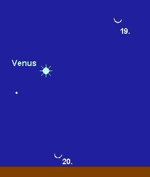 hat ihre Glanzzeit als Morgenstern hinter sich. Ihre Sichtbarkeit verkürzt sich deutlich. Geht sie zu Monatsbeginn um 5:00 MESZ auf, so erfolgt ihr Aufgang am Monatsletzten erst um 5:45 MEZ. Der –3.9m helle Planet tritt am 9. Oktober ins Sternbild Jungfrau, bewegt sich somit in zunehmend südlichere Bereiche der Ekliptik. Die schmale Mondsichel befindet sich am Morgen des 19. Oktober 6° rechts oberhalb, und am Morgen des 20. Oktober 7° unterhalb des noch immer strahlenden Morgensterns. Im Teleskop präsentiert Venus ein fast volles Scheibchen, dessen Durchmesser von 11.0“ auf 10.3“ abnimmt, während der Beleuchtungsgrad von 91% auf 96% anwächst.