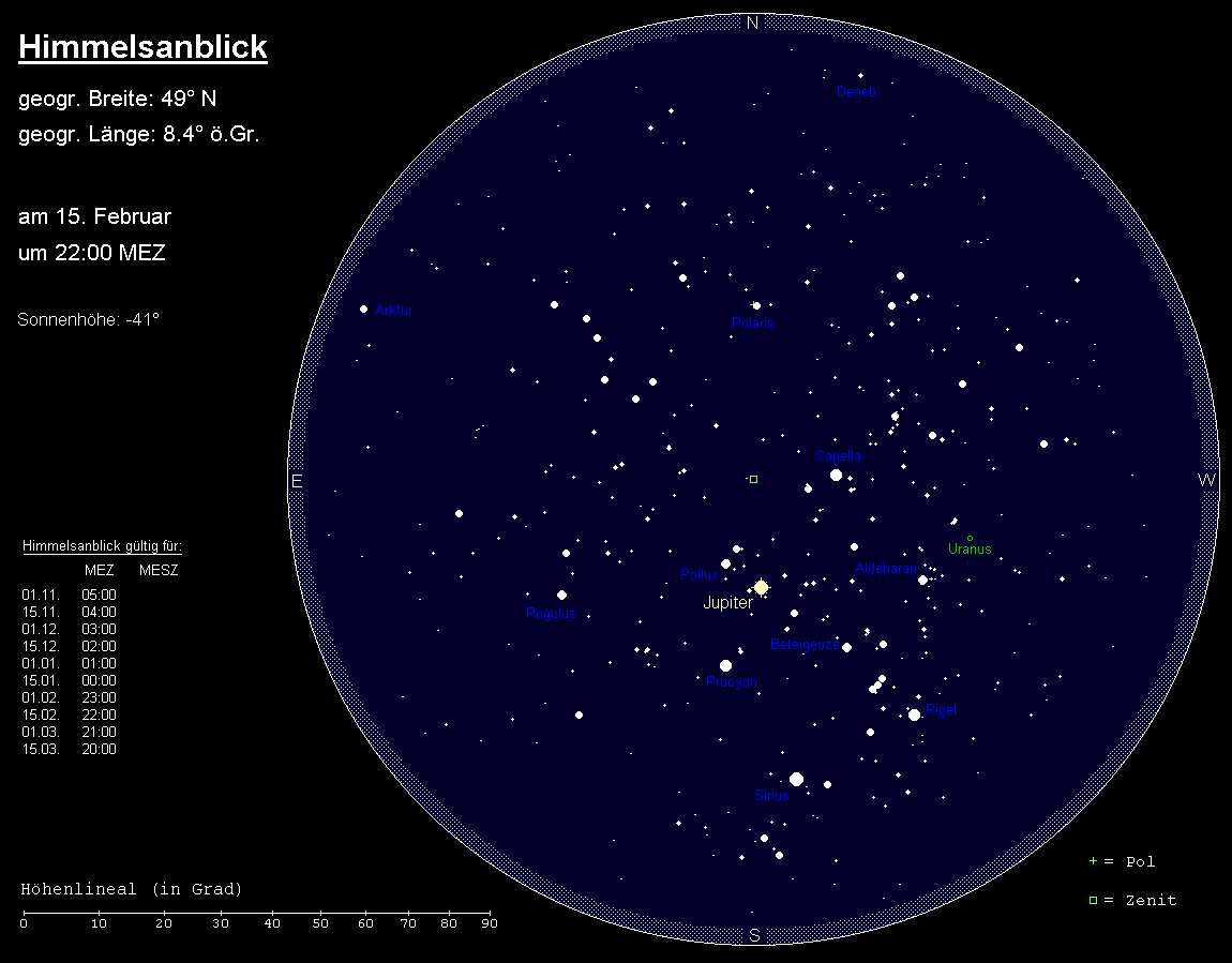 stand Anfang Januar in Opposition zur Sonne. Er ist das dominierende Objekt der ganzen Nacht. Im Sternbild Zwillinge positioniert erreicht er große Horizonthöhen und ist somit auch teleskopisch optimal zu beobachten. Bis zum Monatsende geht die Helligkeit des sich rückläufig durch das Sternbild Zwillinge bewegenden Riesenplaneten auf –2.4m zurück. Seine Untergänge verlagern sich im Monatsverlauf von 6:45 MEZ auf 5:00 MEZ. In der Nacht vom 26. auf den 27. Februar finden wir den noch fast vollen Mond nahe Jupiter. Kurz vor dem Untergang können wir den Mond 4.5° rechts oberhalb des Gasplaneten finden. Im Teleskop präsentiert der größte Planet unseres Sonnensystems ein ovales Scheibchen, dessen scheinbarer Äquatordurchmesser von 45.7“ auf 43.0“ schrumpft. Jupiter zeigt eine hochdynamische Atmosphäre mit dem auffälligen Nördlichen und Südlichen Äquatorialband, wobei am Südrand des letzteren der auffällige Große Rote Fleck gefunden werden kann. Weitere Bänder können mit größeren Instrumenten beobachtet werden. Darüber hinaus bieten die vier hellsten Jupitermonde interessante Konstellationen, die von Nacht zu Nacht sehr unterschiedlich ausfallen. Zudem sind zahlreiche Bedeckungen und Verfinsterungen durch Jupiter bzw. seinen Schatten, sowie Durchgänge und Schattenvorübergänge der Monde vor der Jupiterscheibe zu beobachten. Spezialisten können sich an dem weiter außen umlaufenden Mond Himalia versuchen, der sich bis zu einem Grad von Jupiter entfernen kann, allerdings nur 15.0m hell ist. Mitte Februar findet man ihn etwa 40‘ nordöstlich von Jupiter.
