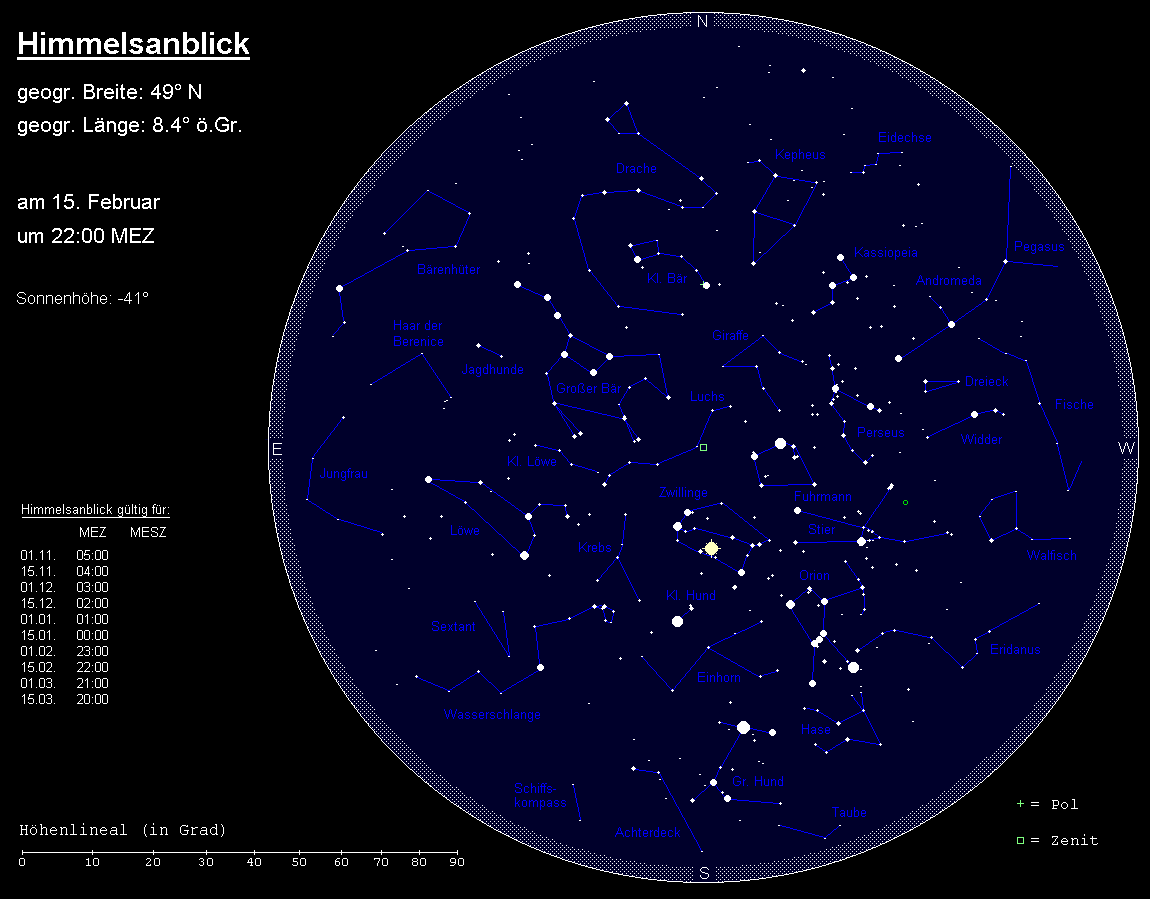 Im Südwesten ist der Walfisch größtenteils unter dem Horizont verschwunden, und das Sternbild Eridanus ist ebenfalls bereits zu größeren Teilen untergegangen.
