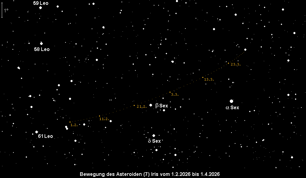 steht am 27. Februar im Sternbild Sextant in Opposition zur Sonne und erreicht dabei eine Maximalhelligkeit von 8.9m. Zu Monatsbeginn ist Kleinplanet Nr. 7 erst 9.3m hell. Die Aufsuche des Kleinplaneten südlich des Sternbilds Löwe gestaltet sich aufgrund fehlender prägnanter Umgebungssterne nicht ganz einfach. Am besten beobachtet man Iris in den zwei Stunden um die Kulmination. Diese findet zu Monatsbeginn um 2:30 MEZ, am Monatsende um 0:30 MEZ statt.