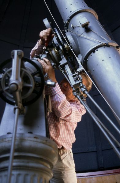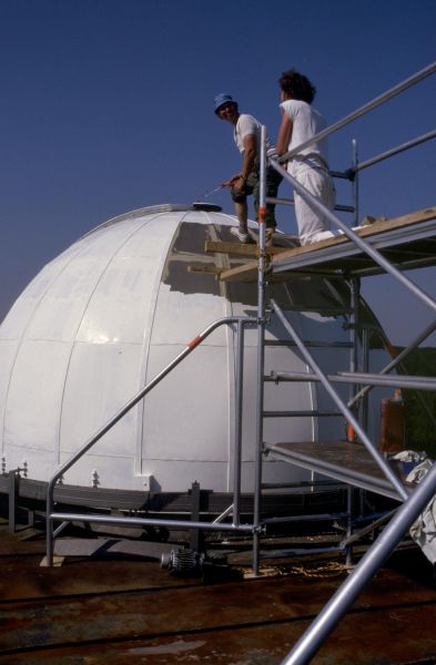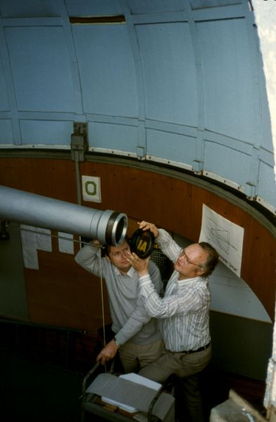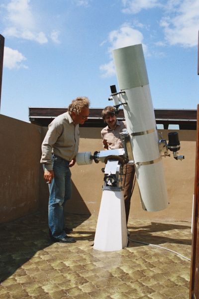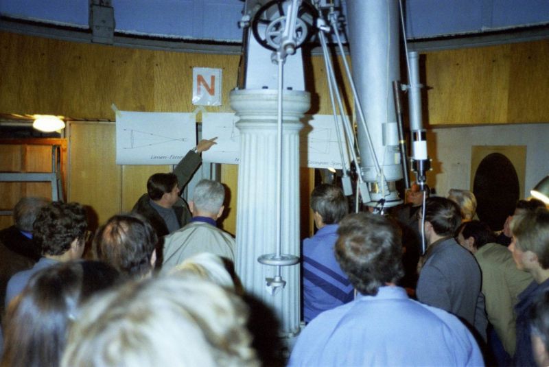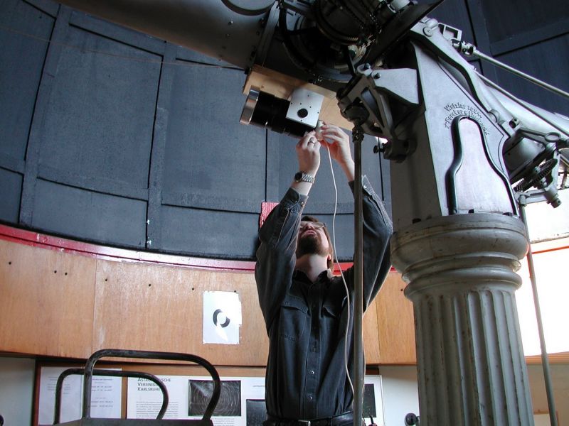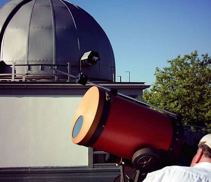 1979 konnte die Volkssternwarte auf das Max-Planck-Gymnasium in Rüppurr im Süden von Karlsruhe verlegt werden, auf dessen Dach seit 1959 ein historischer Steinheil-Refraktor von 16,5 cm Durchmesser steht (siehe Geschichte des Refraktors und der Sternwarte). Mit Zuschüssen der Stadt Karlsruhe konnte 1988 das historische Objektiv durch einen modernen Halbapochromaten der Firma Lichtenknecker von 15 cm Durchmesser ersetzt werden. Kurz vorher konnte ebenfalls mit Mitteln der Stadt Karlsruhe ein Spiegelteleskop mit 28 cm Durchmesser (Celestron C11) zur Verbesserung der Sternwartenarbeit angeschafft werden.
