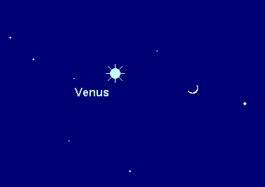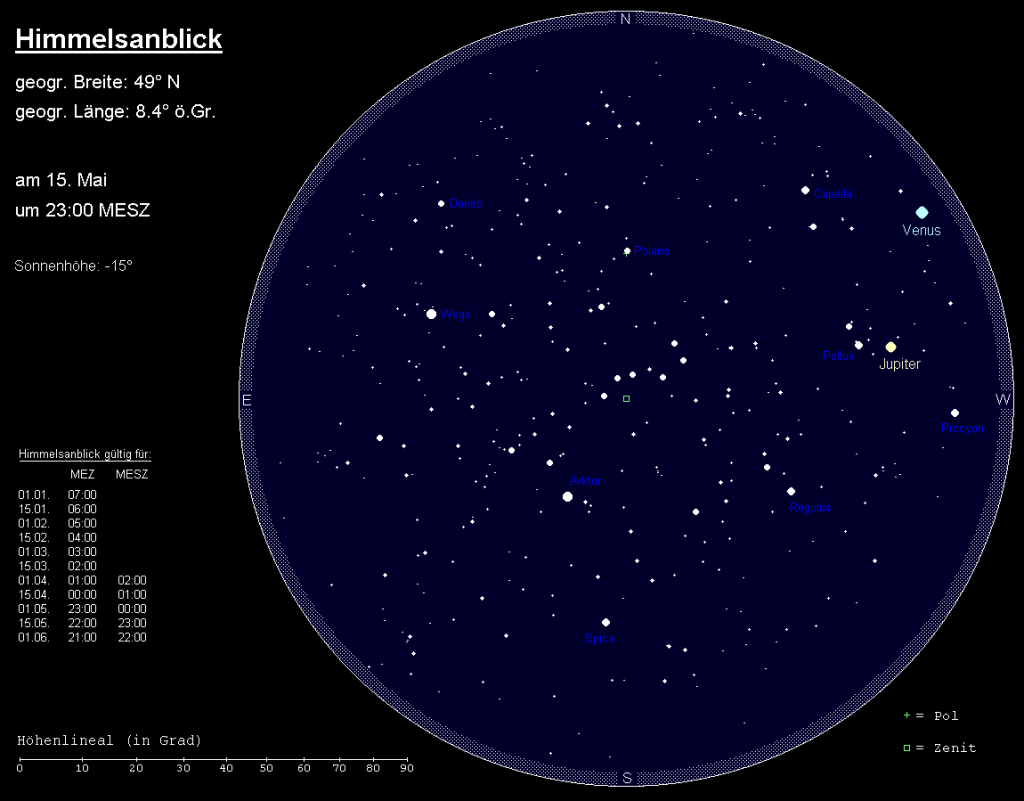 erreicht gegen Monatsende die größten Horizonthöhen während dieser Sichtbarkeit. Venus ist das auffälligste Objekt der ersten Nachtstunden und kann bereits in der hellen Dämmerung gut gesehen werden. Der –3.9m helle Planet geht am 1. Mai um 23:15 MESZ unter, am 31. Mai um 0:00 MESZ. Venus bewegt sich zunächst durch das Sternbild Stier und wechselt am 19. Mai in das Sternbild Zwillinge, wobei sie sich Jupiter annähert. Am 3. Mai passiert sie Aldebaran 7° nördlich. Am 18. Mai finden wir die Mondsichel 4° rechts der Venus. Im Teleskop erkennt man ein etwa 12.5“ großes Scheibchen, das zu etwa 85% beleuchtet ist.