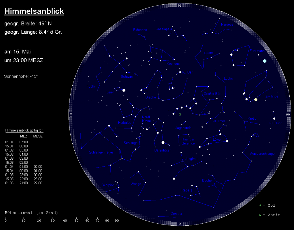 Zur Standardbeobachtungszeit (24:00 MESZ am Monatsanfang, 23:00 MESZ zur Monatsmitte und 22:00 MESZ am Monatsende) steht der Große Wagen über unseren Köpfen im Zenit. Er ist der auffälligste Teil des größeren Sternbilds Großer Bär. Unterhalb der Wagendeichsel leuchtet das nur aus zwei Sternen bestehende Sternbild Jagdhunde. In der fünffachen Verlängerung der vorderen Wagensterne stoßen wir auf den Polarstern, der stets genau im Norden steht. Er ist der hellste Stern des Sternbilds Kleiner Bär, das außer dem Polarstern noch zwei hellere Sterne aufweist, die nun fast ihre höchste Stellung erreicht haben. Der Gegenpart des Großen Bären, das Sternbild Kassiopeia oder Himmels-W, steht nun tief über dem Nordhorizont.