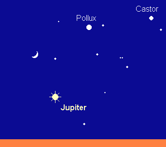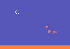 kann von Spezialisten mit einem Fernglas eventuell um die Monatsmitte erstmals knapp über dem morgendlichen ONO-Horizont gesichtet werden. Am 15. Mai befindet sich der 1.3m helle rote Planet 5° rechts unterhalb der schmalen Mondsichel. Die Beobachtung sollte gegen 5:15 MESZ durchgeführt werden. Am Monatsende ergibt sich die beste Beobachtungszeit gegen 4:45 MESZ.