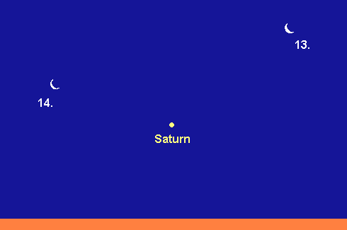 kann ab der zweiten Monatshälfte am Morgenhimmel gesichtet werden. Der 0.9m helle Ringplanet bewegt sich durch eine Randregion des Sternbilds Walfisch, das man südlich des Sternbilds Fische findet, und erscheint somit über dem Osthorizont. Die beste Beobachtungszeit ergibt sich zur Monatsmitte gegen 5:00 MESZ, am Monatsende gegen 4:15 MESZ. Am Morgen des 13. bzw. 14. Mai kann eventuell die schmale Mondsichel beim Auffinden helfen. Diese steht am 13. Mai 9° rechts oberhalb des Ringplaneten am 14. Mai 7° links oberhalb desselben.