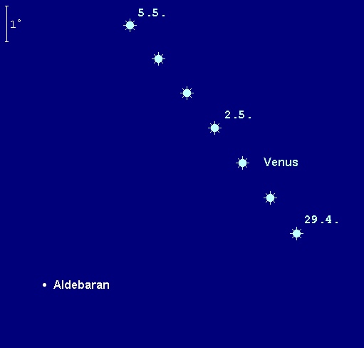 steht am 14. Mai in unterer Konjunktion mit der Sonne und eilt in den folgenden Tagen rasch ostwärts. Spezialisten können bereits kurz nach dem 20. Mai versuchen, den flinken Planeten in der hellen Dämmerung knapp über dem NW-Horizont auszumachen. Am 22. Mai findet man den –1.4m hellen Planeten um 21:30 MESZ etwa 4° über dem Horizont. Bis zum Monatsende wird er zu einem im Fernglas einfachen Objekt, und kann eventuell sogar mit dem bloßen Auge gesichtet werden. Am 31. Mai kann der –0.6m helle Planet gegen 22:15 MESZ am besten beobachtet werden. Merkur bewegt sich durch das Sternbild Stier, dessen Sterne in der Dämmerung aber kaum erkennbar sind.
