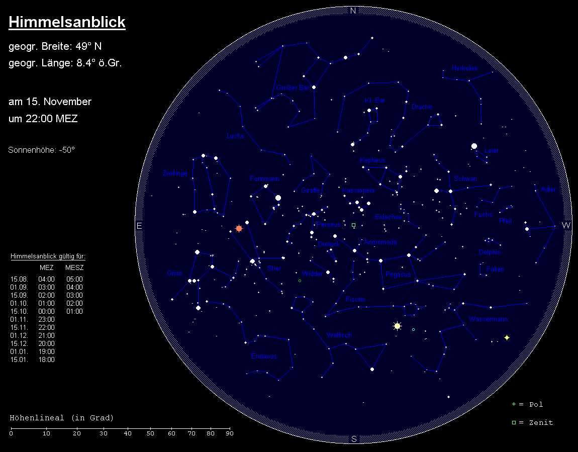 Im Süden kulminiert das große Sternbild Walfisch, von dem nur der südliche Stern Diphda und der Kopf auffälliger sind. Oberhalb des Walfischs stehen die Sternbilder Widder und Dreieck.