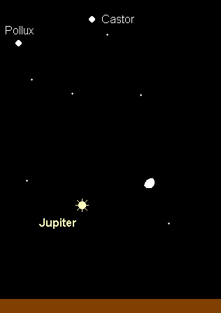stand Anfang Januar in Opposition zur Sonne. Er ist das dominierende Objekt der ganzen Nacht. Im Sternbild Zwillinge positioniert erreicht er große Horizonthöhen und ist somit auch teleskopisch optimal zu beobachten. Bis zum Monatsende geht die Helligkeit des sich rückläufig durch das Sternbild Zwillinge bewegenden Riesenplaneten auf –2.4m zurück. Seine Untergänge verlagern sich im Monatsverlauf von 6:45 MEZ auf 5:00 MEZ. In der Nacht vom 26. auf den 27. Februar finden wir den noch fast vollen Mond nahe Jupiter. Kurz vor dem Untergang können wir den Mond 4.5° rechts oberhalb des Gasplaneten finden. Im Teleskop präsentiert der größte Planet unseres Sonnensystems ein ovales Scheibchen, dessen scheinbarer Äquatordurchmesser von 45.7“ auf 43.0“ schrumpft. Jupiter zeigt eine hochdynamische Atmosphäre mit dem auffälligen Nördlichen und Südlichen Äquatorialband, wobei am Südrand des letzteren der auffällige Große Rote Fleck gefunden werden kann. Weitere Bänder können mit größeren Instrumenten beobachtet werden. Darüber hinaus bieten die vier hellsten Jupitermonde interessante Konstellationen, die von Nacht zu Nacht sehr unterschiedlich ausfallen. Zudem sind zahlreiche Bedeckungen und Verfinsterungen durch Jupiter bzw. seinen Schatten, sowie Durchgänge und Schattenvorübergänge der Monde vor der Jupiterscheibe zu beobachten. Spezialisten können sich an dem weiter außen umlaufenden Mond Himalia versuchen, der sich bis zu einem Grad von Jupiter entfernen kann, allerdings nur 15.0m hell ist. Mitte Februar findet man ihn etwa 40‘ nordöstlich von Jupiter.