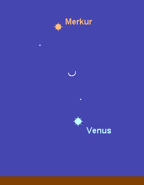 stand am 21. Januar in oberer Konjunktion mit der Sonne und gewann in den folgenden Tagen langsam an Abstand zu unserem Zentralgestirn. In den Tagen um den 6. Februar können Spezialisten versuchen, den flinken Planeten tief über dem westlichen Abendhorizont erstmals auszumachen. Der –1.1m helle Planet ist gegen 18:00 MEZ am besten zu finden. In den folgenden Tagen gewinnt er, bei nahezu gleicher Helligkeit, rasch an Höhe. Zwischen dem 10. und 20. Februar ist er gegen 18:15 bzw. 18:45 MEZ mit dem bloßen Auge recht gut erkennbar. Am 18. Februar findet man die hauchdünne Mondsichel 3.5° unterhalb von Merkur. Am 19. Februar steht Merkur mit einer Helligkeit von –0.6m in größter östlicher Elongation (18° von der Sonne entfernt). Danach nähert er sich angsam wieder dem Horizont, gleichzeitig geht seine Helligkeit nun rasch zurück. Am 25. Februar (nur noch 0.8m hell) ist er bereits zu einem schwierigen Objekt geworden, wobei Venus bei der Aufsuche helfen kann. Am 27. Februar steht die Venus 4.5° links unterhalb von Merkur (1.5m), so dass letzterer möglicherweise noch identifiziert werden kann. Nach dem 28. Februar dürften selbst Spezialisten vergeblich nach Merkur suchen.