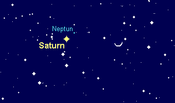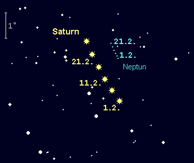 ist ein Objekt des frühen Abendhimmels. Der 8.0m helle fernste Planet bewegt sich langsam rechtläufig durch den westlichen Teil des Sternbilds Fische, nahe Saturn, der als Aufsuchhilfe dienen kann. Seine Untergänge verlagern sich im Monatsverlauf von 21:30 MEZ auf 19:30 MEZ. Da er etwa zwei Stunden zuvor in den horizontnahen Dunstschichten unsichtbar wird, endet seine Sichtbarkeit etwa zur Monatsmitte. Am 15. Februar wandert Saturn zum dritten Mal, dieses Mal in 0.9° südlichem Abstand, an Neptun vorüber - keine leicht zu beobachtende Konjunktion. Am 19. Februar steht die schmale Mondsichel 3.5° rechts von Neptun, was aber wohl nur Spezialisten beobachten können.